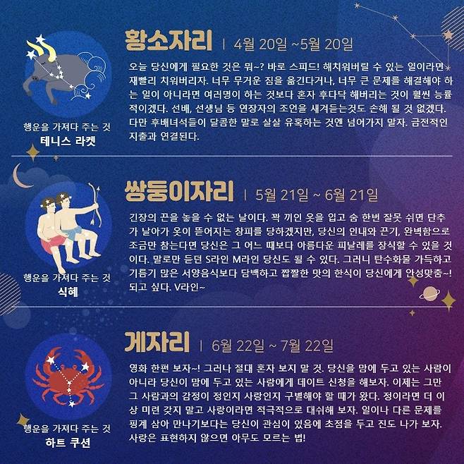 게자리 (6.22 ~ 7.22) 영화 한편 보자~! 그러나 절대 혼자 보지 말 것. 당신을 맘에 두고 있는 사람이 아니라 당신이 맘에 두고 있는 사람에게 데이트 신청을 해보자. 이제는 그만 그 사람과의 감정이 정인지 사랑인지 구별해야 할 때가 왔다. 정이라면 더 이상 미련 갖지 말고 사랑이라면 적극적으로 대쉬해 보자. 일이나 다른 문제를 핑계 삼아 만나기보다는 당신이 관심이 있음에 초점을 두고 진도 나가 보자. 사랑은 표현하지 않으면 아무도 모르는 법! 행운을 가져다 주는 것 : 하트 쿠션