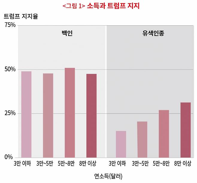 그렇다면 ‘경제적 불안으로 고통받는 백인 중하층이 트럼프를 지지한다’는 주장은 얼마나 틀렸을까? 〈그림 1〉을 보자. 밴더빌트 대학의 래리 바텔스 교수가 지난해 1월에 실시한 여론조사를 직접 분석해보았다. 백인과 유색인종을 구분해 소득별 트럼프 지지를 살펴봤다. 백인 저소득층이 백인 고소득층에 비해 트럼프를 지지할 확률은 높지 않다. 유색인종의 경우, 오히려 소득이 높을수록 트럼프를 지지할 가능성이 커졌다. 인종 간 트럼프 지지 차이가 소득 간 차이보다 더 크게 나타난다. 2016년 대선에서 트럼프에게 투표한 유권자 전체에서 대학 교육을 받지 않고 중위소득 이하인 백인 노동자 계층은 31.2%였다. 전체 유권자 중 백인 노동자 계층의 비중(30% 초반)과 크게 차이가 나지 않는다. 계층이 특별히 트럼프를 더 지지하는 것이 아니라는 뜻이다.