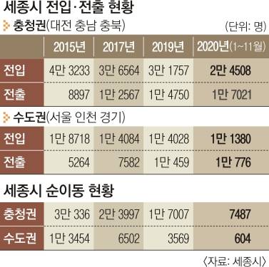 세종시는 2015년부터 지금까지 전입 인구가 7만~8만명 수준을 유지하지만 전출은 2015년 3만 950명에서 지난해 1~11월 5만 9332명을 기록해 두 배 가까이 급증했다고 밝혔다. 전입은 충청권인 대전·충남·충북이 2015년 4만 3233명에서 지난해 1~11월 2만 4508명으로 절반 가까이 감소한 반면 전출은 두 배쯤 늘었다. 2015년 세종시민 8897명이 충청권으로 떠났으나 지난해 1~11월에는 그 숫자가 1만 7021명으로 커졌다. 세종시 전입자는 대전에서 온 사람이 가장 많다. 하지만 2015년 2만 5788명에 이르던 대전에서의 전입이 지난해 1~11월 1만 3856명으로 크게 줄었다. 같은 기간 세종에서 대전으로 이전한 시민은 3684명에서 7629명으로 두 배 넘게 늘었다. 보람동의 한 30대 시민은 “세종시 초기에는 전세가 훨씬 싸고 아파트를 분양받을 기회도 있어 대전에서 대거 이사를 왔는데 요즘은 엄청 오른 아파트값에 분양받기도 힘들어 유턴하는 젊은 부부가 많다”고 했다.