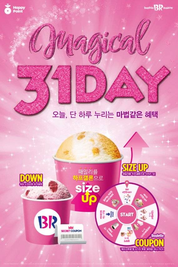 또 '매직 쿠폰'은 매장에서 31데이에 참여 시 발급되는 구매 영수증을 통해 '쿼터 4000원 할인' 쿠폰으로 제공된다. 해당 쿠폰은 2월 1일부터 2월 10일까지 매장 방문 시 사용 가능하다. 기존 '31데이'와 동일한 사이즈 업그레이드 혜택도 제공한다. 31일 단 하루 동안 패밀리(2만2000원, 5가지 맛) 구매 시 하프갤론(2만6500원, 6가지 맛)으로 즐길 수 있다.