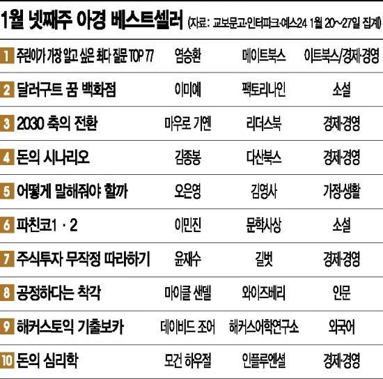 아시아경제신문은 지난 20~27일 도서 판매량 기준으로 베스트셀러를 선정했다. 교보문고·인터파크·예스24 등 주요 온오프라인 서점의 판매량 순위를 참고하되, 아시아경제 기자들의 평점까지 더해 집계한 종합 순위다.