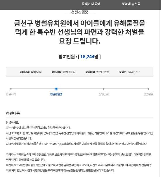 ‘금천구 병설유치원에서 아이들에게 유해물질을 먹게 한 특수반 선생님의 파면과 강력한 처벌을 요청 드립니다’라는 제목으로 지난 27일 올라온 청원은 현재 1만6200여명 이상 동의글이 달려있는 상태다.