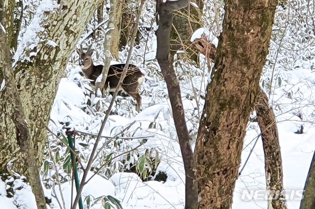 [제주=뉴시스]우장호 기자 = 제주 산간과 북부 지역을 중심으로 눈이 내린 29일 오전 제주 한라산 관음사 탐방로 인근 숲에 먹이를 찾아 내려온 노루 한 마리가 눈길을 걸어가고 있다. 2021.01.29. woo1223@newsis.com