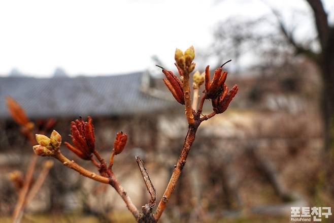 창경궁 통명전 뒤 생강나무는 꽃봉오리 물이 제대로 올랐습니다.