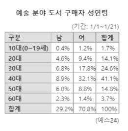 예술 분야 도서의 주요 구매자는 40대가 41.1%로 가장 큰 비중을 차지했으며, 30대도 24.6%의 비율을 보이며 상대적으로 높게 나타났다. 남녀 성비는 3 대 7로 여성 비중이 압도적으로 높았다.