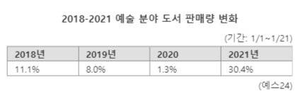 온라인 서점 예스24가 29일 예술 분야 도서 판매량을 분석한 결과 작년 동기 대비 올해 초 예술 분야 도서 판매량이 30.4% 증가한 것으로 나타났다. 예스24는 "코로나19 장기화에 따른 사회적 거리두기 강화로 사람들이 집에 머무르는 시간이 늘어나면서 그림 그리기나 클래식 감상 등의 취미생활에 대한 관심이 높아지고 있기 때문"으로 분석했다.