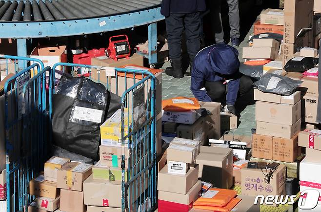 (화성=뉴스1) 조태형 기자 = 29일 오전 경기도 화성시내 한 택배센터에서 노동자들이 배송 준비 작업을 하고 있다.