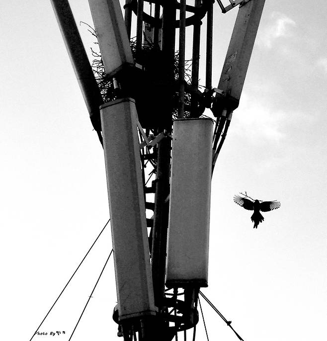 까치 부부가 통신중계기에