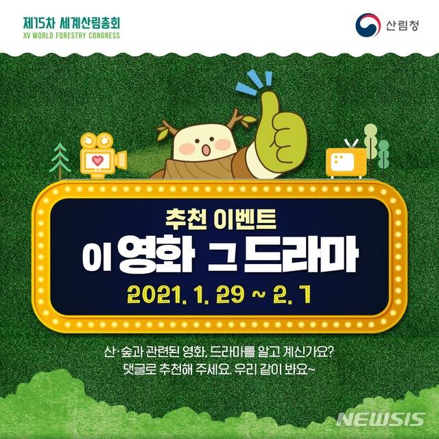 산림에 대한 국민의 관심을 높이고 내년에 개최 예정인 제15차 세계산림총회(WFC)를 홍보키 위해 마련된 이번 행사는 국민 누구나 참여할 수 있으며, 산과 숲을 주제로 하거나 배경으로 한 영화나 드라마를 댓글로 추천하면 참여된다.