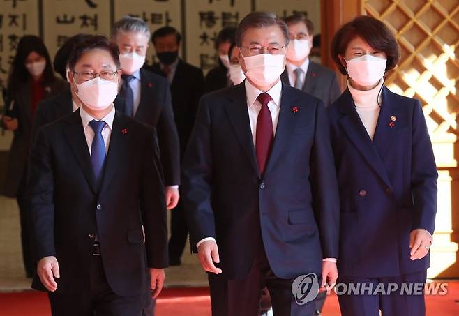 (서울=연합뉴스) 이진욱 기자 = 문재인 대통령이 29일 오후 청와대에서 박범계 법무부 장관(왼쪽), 한정애 환경부 장관에게 임명장을 수여한 뒤 환담장으로 이동하고 있다, 2021.1.29
