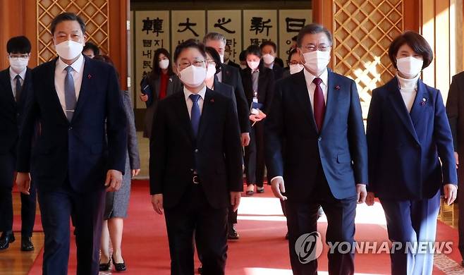 (서울=연합뉴스) 이진욱 기자 = 문재인 대통령이 29일 오후 청와대에서 박범계 법무부 장관(왼쪽 두번째), 한정애 환경부 장관(오른쪽), 황기철 국가보훈처장(왼쪽)에게 임명장을 수여한 뒤 환담장으로 이동하고 있다, 2021.1.29