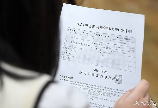 | ▲ 2021학년도 대학수학능력시험(수능) 성적통지표 배부일인 지난 2020년 12월 23일 오전 서울 동대문구 해성여자고등학교에서 학생들이 수능 성적표를 확인하고 있다. |