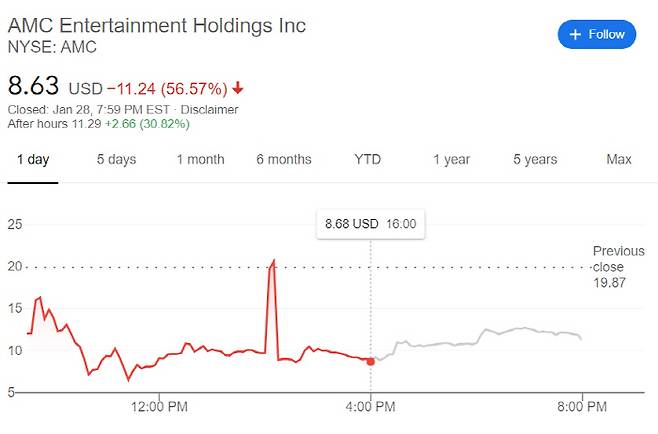 실제 전날 301.21% 치솟았던 AMC 주가는 56.57%까지 떨어졌고, 블랙베리(41.35%↓)와 노키아(13.25%↓) 등도 줄줄이 타격을 받았다.