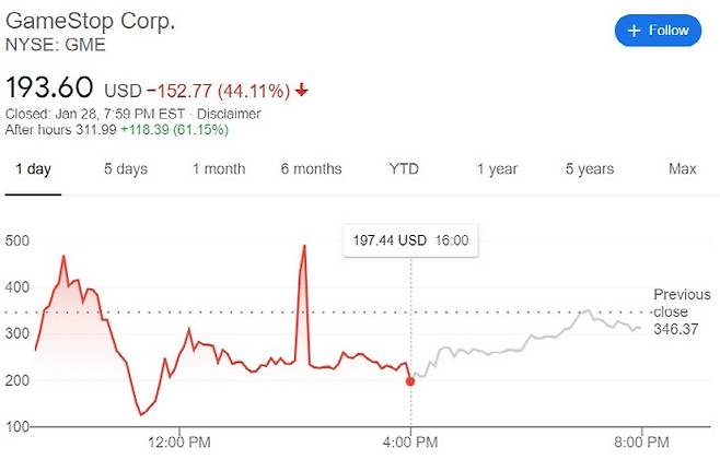 이날에도 장 중 한때 492.02달러까지 치솟았다가 순식간에 지수는 하락 반전했다. 게임스톱의 주가 급락에는 월가와 백악관이 전면적으로 나서 투기 조작에 대한 의혹 메시지를 발표한 것이 악재로 작용한 탓이다.