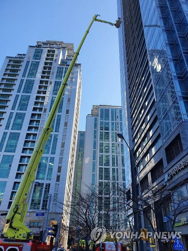 (부산=연합뉴스) 29일 오전 9시 35분께 부산 해운대 센텀시티 한 건물 20층 높이에 고드름이 발생했다는 신고가 접수돼 소방이 굴절사다리차를 이용해 고드름 제거 작업을 벌이고 있다.