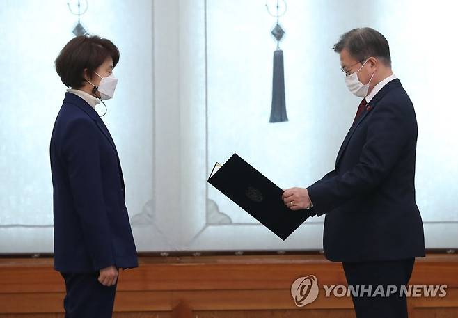 (서울=연합뉴스) 이진욱 기자 = 문재인 대통령이 29일 오후 청와대에서 한정애 신임 환경부 장관에게 임명장을 수여하고 있다. 2021.1.29