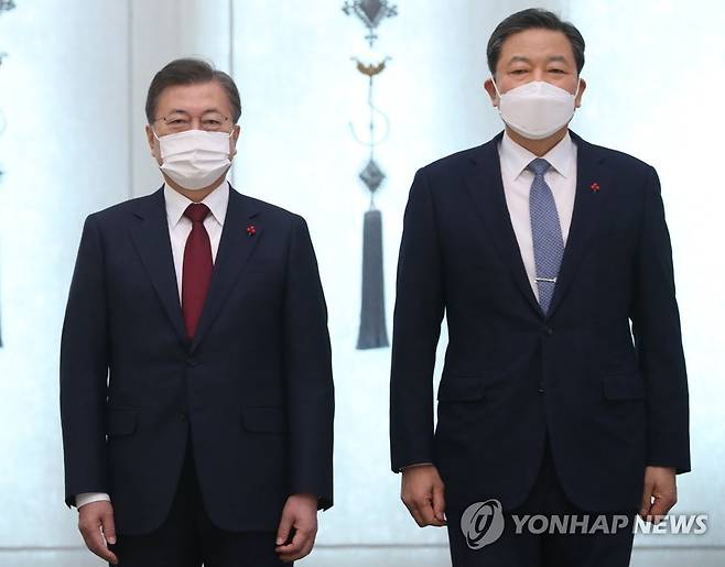 (서울=연합뉴스) 이진욱 기자 = 문재인 대통령이 29일 오후 청와대에서 황기철 신임 국가보훈처장에게 임명장을 수여한 뒤 기념촬영하고 있다. 2021.1.29