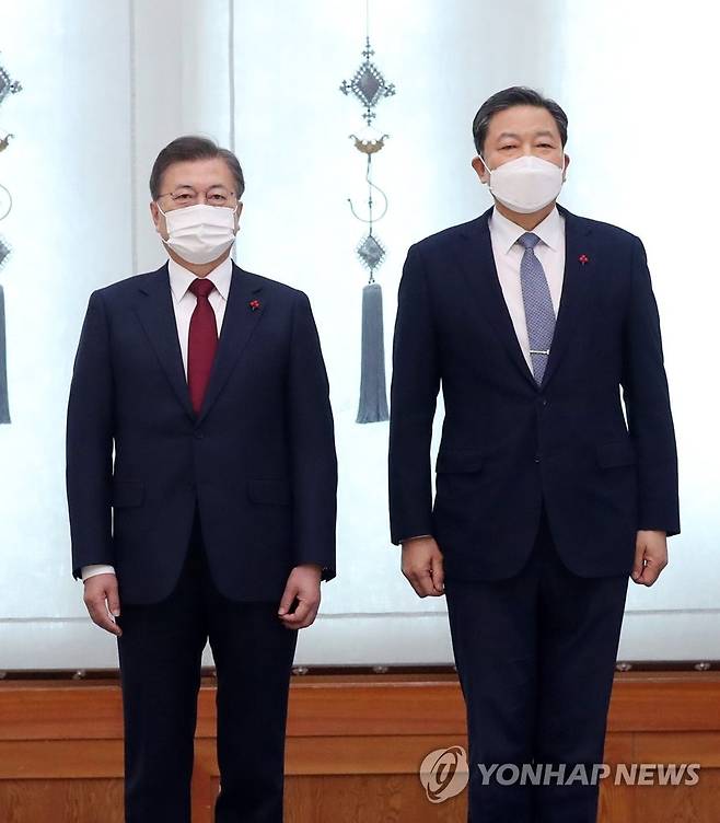 (서울=연합뉴스) 이진욱 기자 = 문재인 대통령이 29일 오후 청와대에서 황기철 신임 국가보훈처장에게 임명장을 수여한 뒤 기념촬영하고 있다. 2021.1.29