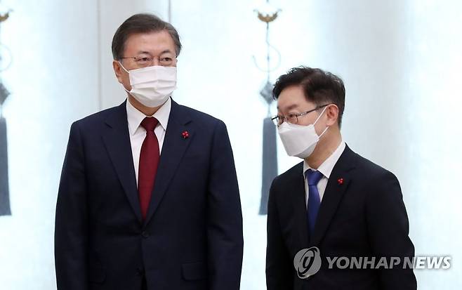 (서울=연합뉴스) 이진욱 기자 = 문재인 대통령이 29일 오후 청와대에서 박범계 신임 법무부 장관(오른쪽)과 기념촬영을 마친 뒤 대기해 있다. 2021.1.29