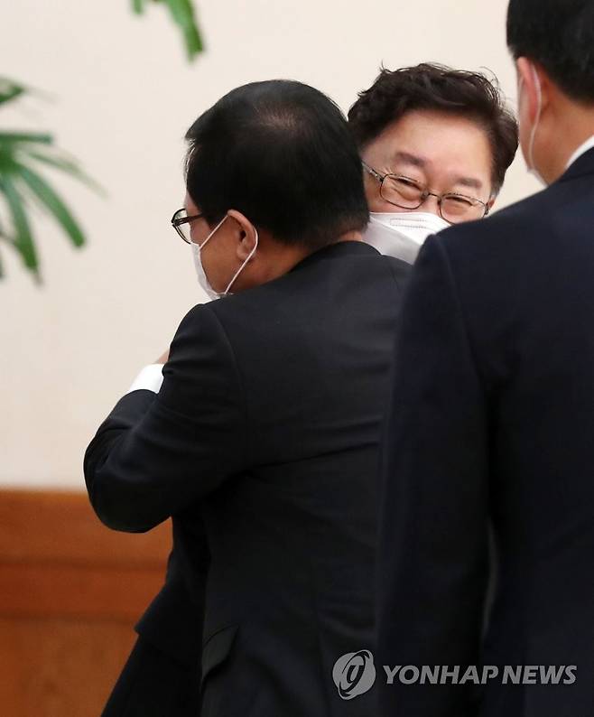 (서울=연합뉴스) 이진욱 기자 = 29일 오후 청와대에서 열린 임명장 수여식에서 박범계 신임 법무부 장관이 유영민 대통령 비서실장(뒤)과 인사하고 있다. 2021.1.29