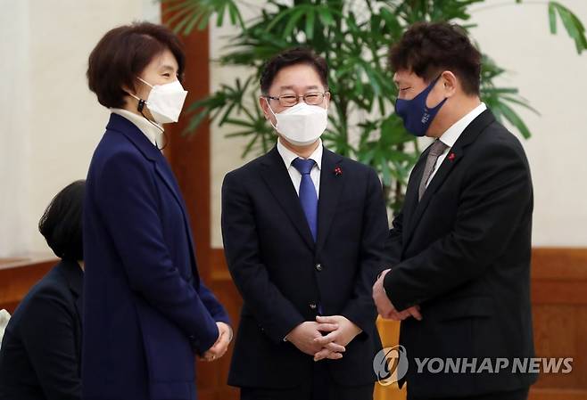 (서울=연합뉴스) 이진욱 기자 = 29일 오후 청와대에서 열린 임명장 수여식에서 최재성 정무수석(오른쪽)이 박범계 법무부 장관(가운데), 한정애 환경부 장관과 대화하고 있다. 2021.1.29