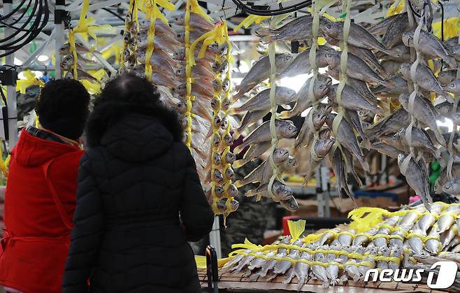 (서울=뉴스1) 구윤성 기자 = 29일 오후 서울 동대문구 경동시장에서 시민들이 장을 보고 있다. 서울시는 이날부터 민족 최대 명절 설을 앞둔 다음달 10일까지 시내 139개 전통시장에서 설 제수용품과 농수축산물을 최대 50% 할인된 가격으로 판매한다고 밝혔다. 참여 시장은 공통적으로 행사기간 동안 시민들이 저렴한 가격으로 명절 제수용품과 농수축산물을 장만할 수 있도록 5~50% 할인 판매한다. 시장별로 제로페이로 결제하거나 일정 금액 이상 구매할 경우 온누리상품권, 떡국용 떡 등을 증정한다. 2021.1.29/뉴스1