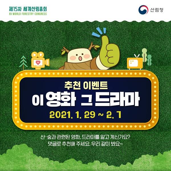 이번 행사는 국민 누구나 참여할 수 있으며 산과 숲을 주제로 하거나 배경으로 하는 영화 및 드라마를 댓글로 추천하는 방식으로 참여가 가능하다.