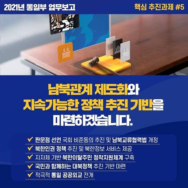 남북관계 제도화와 지속가능한 정책 추진 기반을 마련하겠습니다.