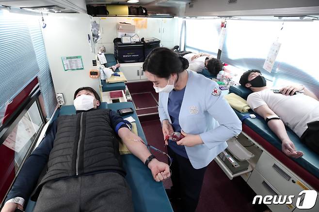 (수원=뉴스1) 조태형 기자 = 29일 오후 경기도 수원시 팔달구 선수촌에서 시 직장운동부 선수들이 신종 코로나바이러스 감염증(코로나19) 장기화에 따른 혈액 부족 해소를 위한 사랑의 헌혈 캠페인에 참여하고 있다. 2021.1.29/뉴스1
