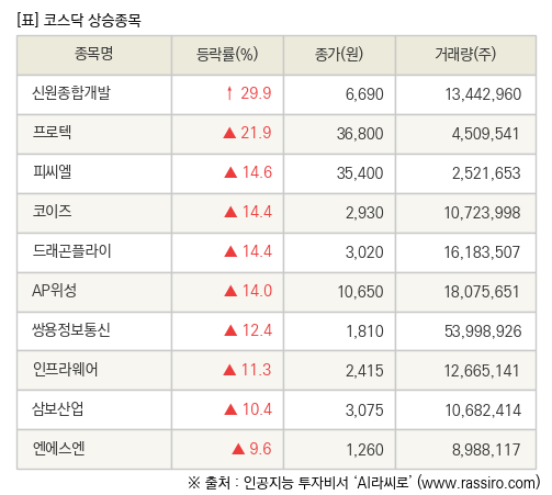 [fnRASSI]장마감, 코스닥 상승 종목(신원종합개발 29.9% ↑)