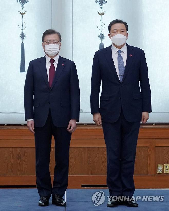 (서울=연합뉴스) 이진욱 기자 = 문재인 대통령이 29일 오후 청와대에서 황기철 신임 국가보훈처장에게 임명장을 수여한 뒤 기념촬영하고 있다. 2021.1.29