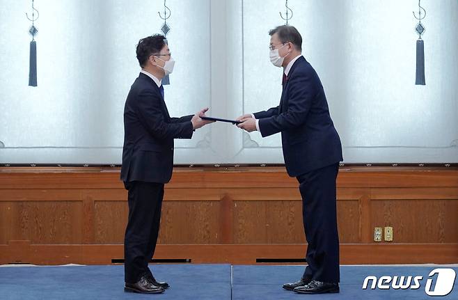 (서울=뉴스1) 이광호 기자 = 문재인 대통령이 29일 오후 청와대에서 박범계 신임 법무부장관에게 임명장을 수여하고 있다. 2021.1.29/뉴스1