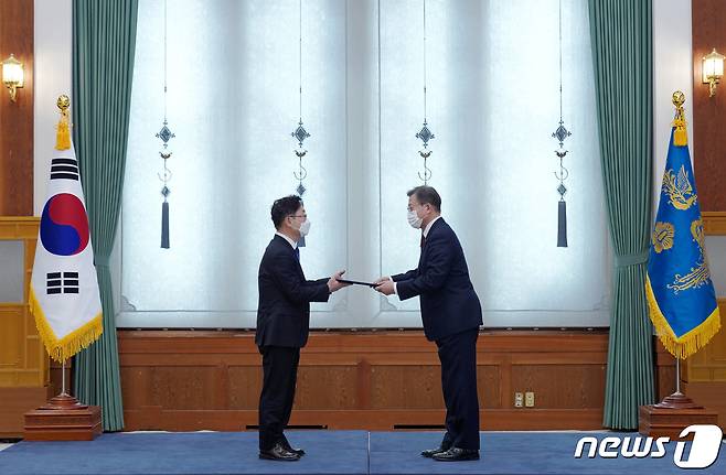 (서울=뉴스1) 이광호 기자 = 문재인 대통령이 29일 오후 청와대에서 박범계 신임 법무부장관에게 임명장을 수여하고 있다. 2021.1.29/뉴스1