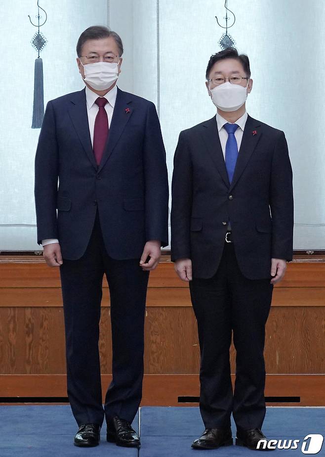 (서울=뉴스1) 이광호 기자 = 문재인 대통령이 29일 오후 청와대에서 박범계 신임 법무부장관에게 임명장을 수여한 후 기념촬영을 하고 있다. 2021.1.29/뉴스1