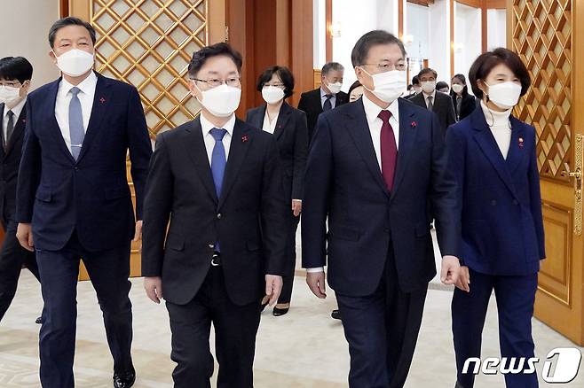 (서울=뉴스1) 이광호 기자 = 문재인 대통령이 29일 오후 청와대에서 박범계 법무부장관(왼쪽 두번째), 한정애 환경부장관(오른쪽), 황기철 국가보훈처장(왼쪽)에게 임명장을 수여한 후 환담장으로 이동하고 있다. 2021.1.29/뉴스1