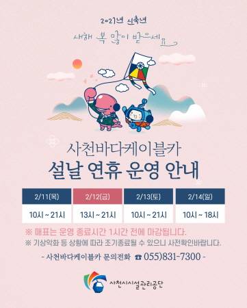 사천시시설관리공단(이사장 박태정)이 2021년 설 연휴 기간인 2월 11∼14일까지 고향을 찾는 귀성객들의 편의를 위해 사천바다케이블카를 정상 운영한다고 29일 밝혔다.