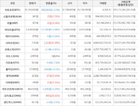 가상화폐 비트코인(-2.4%), 시아코인(+19.39%)