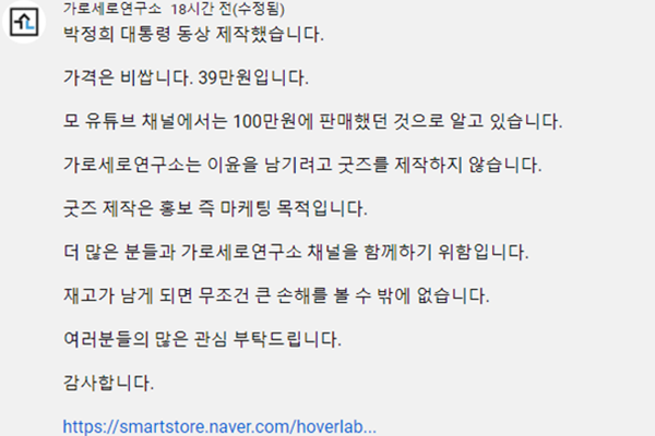 이어 “가로세로연구소는 이윤을 남기려고 굿즈를 제작하지 않는다”며 “굿즈 제작은 홍보 즉 마케팅 목적”이라고 강조했다. 마지막에는 구매 링크를 첨부했다.