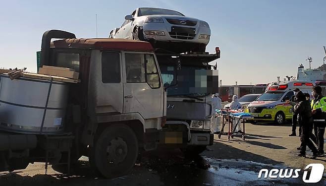 (인천=뉴스1) 정진욱 기자 = 29일 오전 11시28분쯤 인천 중구 북성동 인천항 8부두 주차장에서 화물차 2대가 충돌했다.(인천중부소방서 제공)2021.1.29/뉴스1