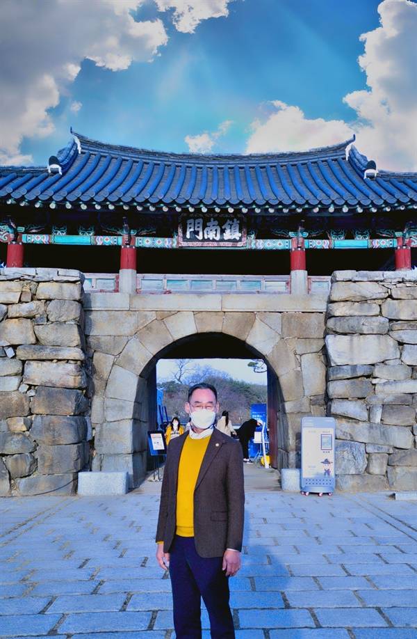 | ▲ 해미읍성 동헌 정문에서 이수의 의원은 전국에서 최초로 중고제 판소리 보존 및 지원에 관한 조례를 만들어 통과시켰다. 그리고 서산시의회에서 5분 발언을 통해 서산 중고제 가무악에 대한 학문적 체계화, 음반복원과 전승활동에 대한 지원방안, 중고제 축제 개최 등을 제안했다. |