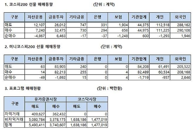 [표]주가지수선물 투자자별 매매동향(1/29)