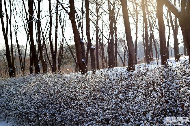키 작은 나무의 작고 여린 잎에 눈꽃이 내려앉았다.