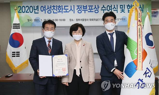(서울=연합뉴스) 정영애 여성가족부 장관(가운데)이 29일 서울 종로구 정부서울청사에서 열린 '2020년 여성친화도시 정부포상 수여식 및 협약식'에서 대통령 표창을 수상한 전남 강진군수 및 관계자들과 함께 기념촬영을 하고 있다. 2021.1.29