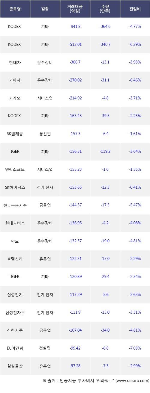 29일, 거래소 기관 순매도상위에 운수장비 업종 4종목