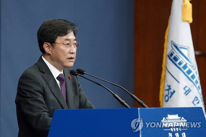 (서울=연합뉴스) 강민석 청와대 대변인이 29일 오후 청와대 춘추관 대브리핑룸에서 김종인 국민의힘 비상대책위원장 발언 관련 브리핑을 하고 있다. 2021.1.29 [청와대 제공. 재판매 및 DB 금지]