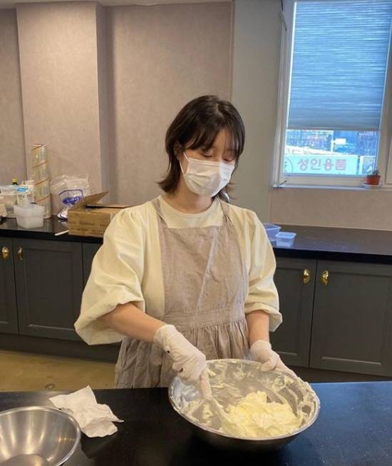 사진 속 나비는 케이크를 만들고 있다. 완성된 케이크가 눈에 띈다.