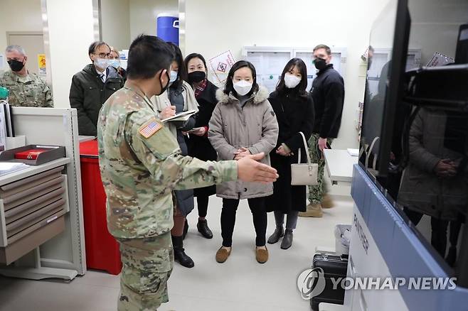 (서울=연합뉴스) 질병관리청 관계자들이 29일 경기 평택시 험프리스 미 육군기지의 브라이언 올굿 병원을 방문해 격리시설, 음압치료실, 코로나19 백신센터 등을 둘러보고 있다. 2021.1.29