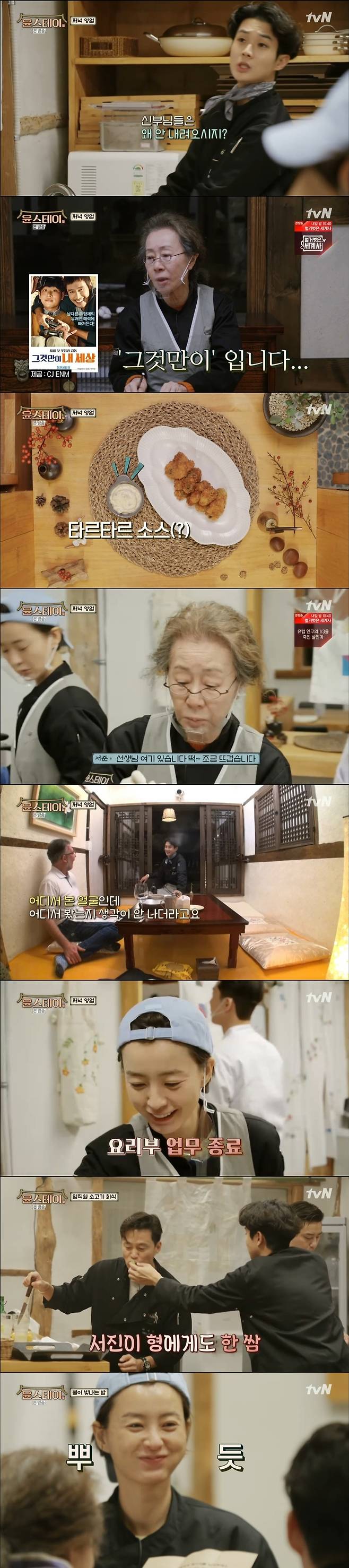 1월 29일 방송된 tvN 예능 프로그램 '윤스테이'에서는 둘째 날 영업도 성공적으로 마친 윤여정, 이서진, 정유미, 박서준, 최우식 모습이 그려졌다.