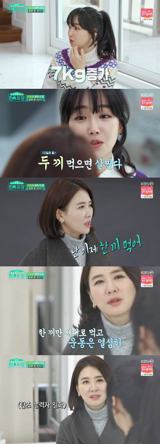이유리는 "드라마가 끝나고 7kg가 쪘다"며 몸매 관리 비법을 물었다. 이어 "김사랑 언니는 세 끼 먹으면 살찐다는 어록을 남겼다. 선배님은 두 끼 먹으면 살찐다고 하지 않으셨냐"고 물었다. 이일화는 "이제는 한 끼 먹는다. 한 끼만 제대로 먹고 운동으로 관리한다"고 밝혔다.