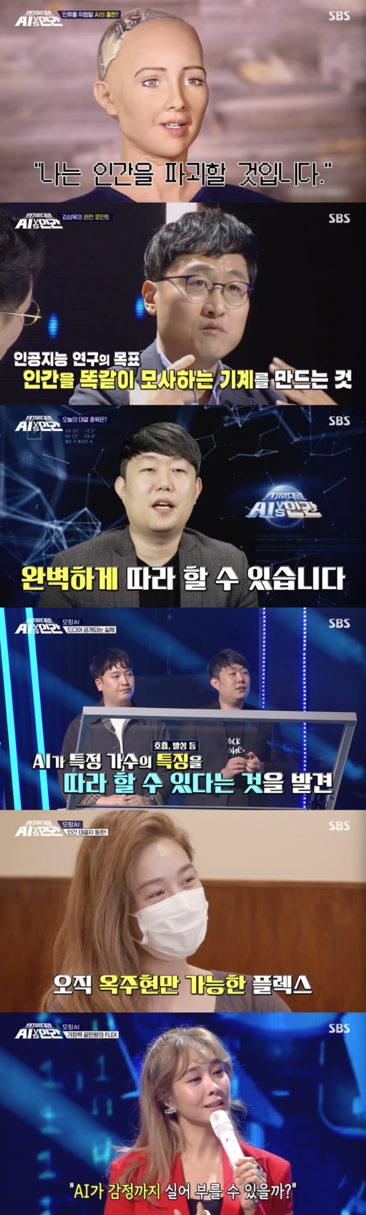 첫 번째 AI와 인간의 모창 대결 주인공은 옥주현이었다. 개발자최희두 씨는 “어떤 가수의 어떤 목소리도 완벽하게 따라할 수 있다. 호흡과 바이브레이션까지도 스스로 만들어서 한다. 저희가 가르쳐 준 게 아니다”라며 “사람의 목소리로 노래 부를 수 있게 만드는 연구를 했다. AI가 특정 가수를 따라할 수 있는 포인트가 있다. 어떤 가수의 목소리든 기본 데이터만 입력하면 모창이 가능하다”고 자신했다.